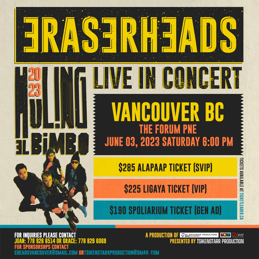 After the successful Reunion Concert in Manila. Eraserheads is embarking on a WorldTour, with the first wave in NorthAmerica. Vancouver will be the first stop in Canada on June 03, 2023.