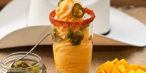 The union of sweet and spicy in each mouthful! Refreshing mango soft serve, rimmed with Tajin (chili/lime) topped with a touch of sweet heat – CANDIED JALAPENOS, otherwise known as COWBOY CANDY!
